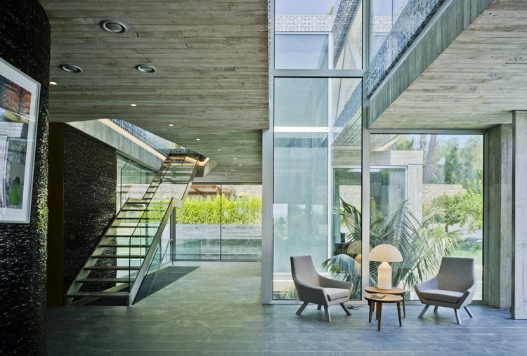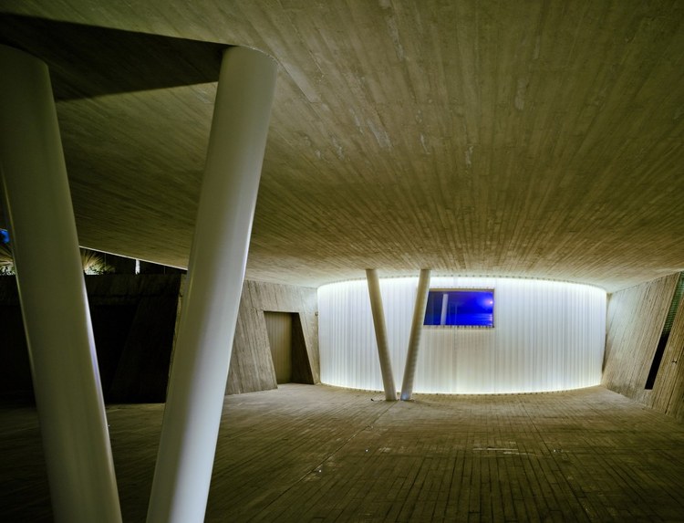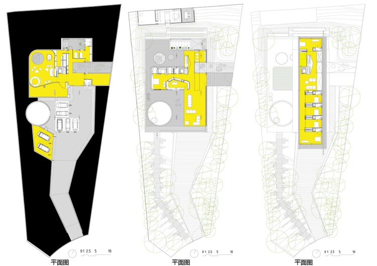 1.舒適性體驗(yàn) 地下室內(nèi)部映照著一定的自然光可以滿足休閑娛樂(lè)所用。趣味從停車庫(kù)開(kāi)始,透過(guò)這里的后擋風(fēng)玻璃窗設(shè)計(jì)可以看見(jiàn)游泳池;由彩色模壓混凝土鋪筑成的人行道加強(qiáng)了房間與室外區(qū)域的聯(lián)系; 2.居住性體驗(yàn) 一層包括一個(gè)C形區(qū)域并向私人開(kāi)放向空間敞開(kāi)。巨大的懸臂頂棚將內(nèi)外區(qū)域連接起來(lái),家人可以在這里聽(tīng)音樂(lè)、看展覽。