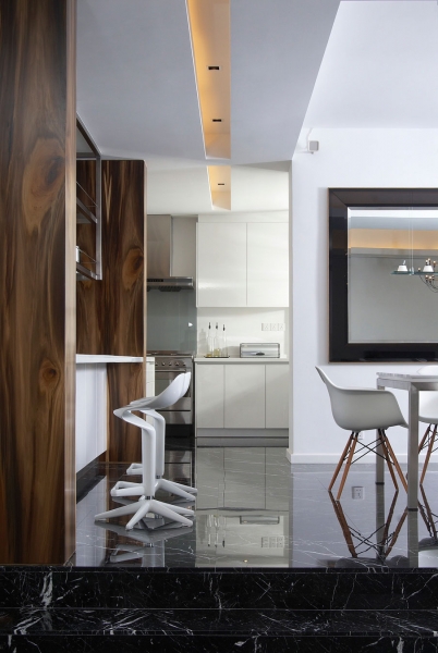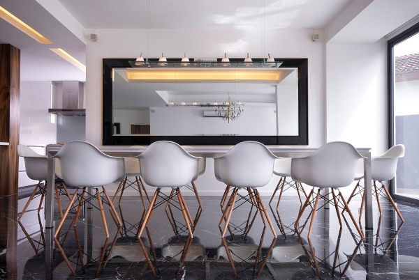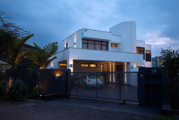 這個4500平方英尺的房子建在8000平方英尺的一個緩坡上降落。房子的方向是特殊的,因為它并不能面對服務道路,但有一個45度的傾斜。它能達到兩個目標:第一,寬度和建筑物的大小是優化;其次,它確保隱私的人。建筑結構保存雖然增加了一些微小的擴展。這房子被漆成白色,這樣一個能欣賞強壯的架構形式。黑暗的鋁框玻璃窗被安裝在眾議院。以補充現代形式、景觀建筑都保持清潔。蓄意使用戲劇性的Serralunga盆與Zamia紙板棕櫚成為焦點的花園。